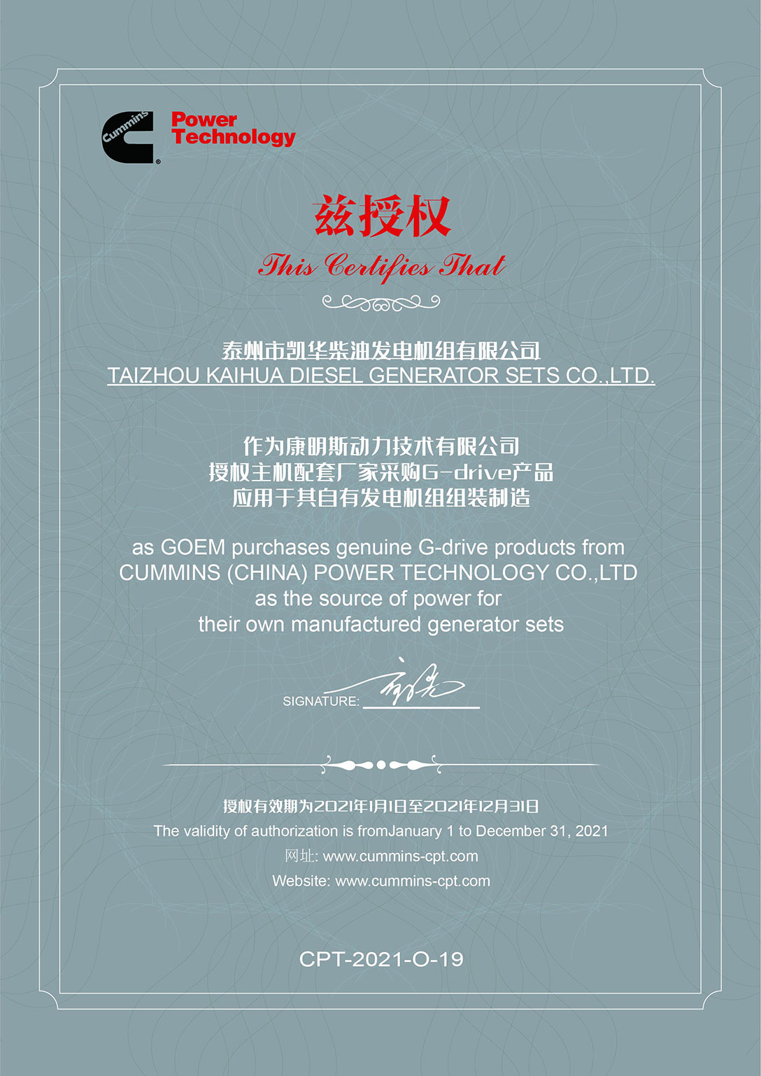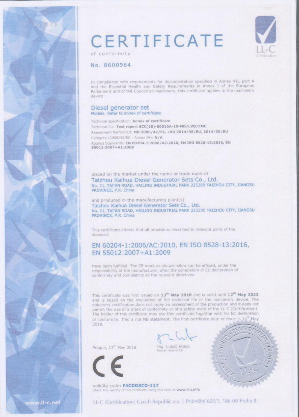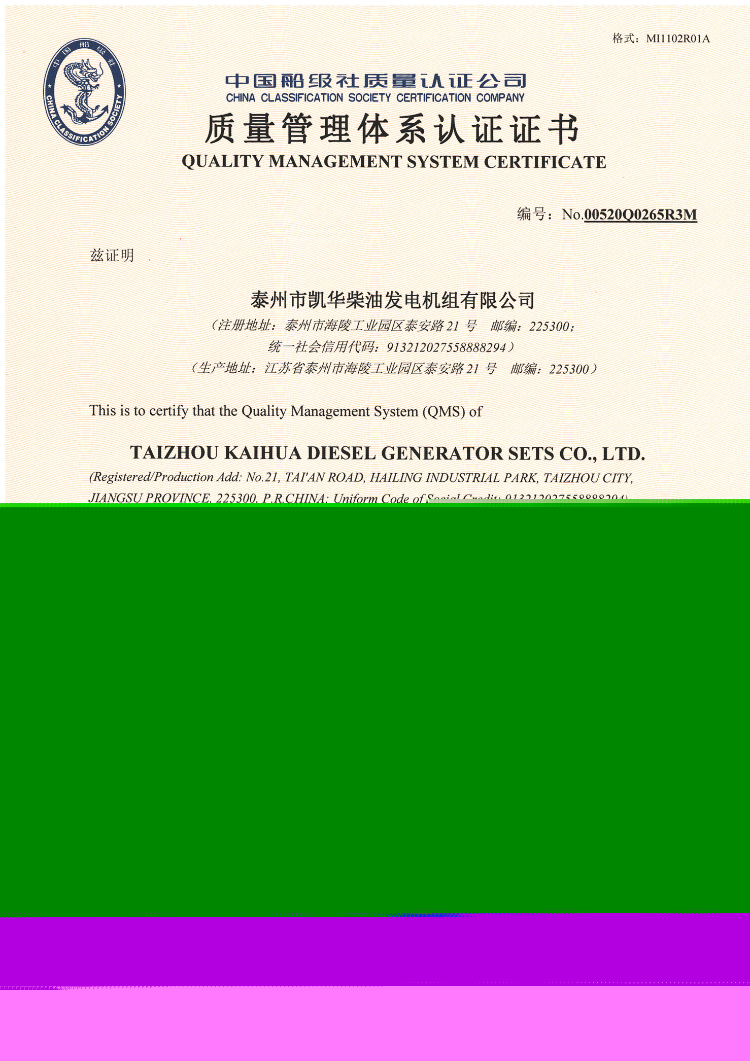 發(fā)電機組廠家凱華公司已先后通過ISO9001質(zhì)量認(rèn)證、泰爾認(rèn)證、ISO14001-2001環(huán)境管理體系認(rèn)證、GB/T28001-2001職業(yè)健康安全管理體系認(rèn)證,歐盟CE認(rèn)證、SGS認(rèn)證等。
